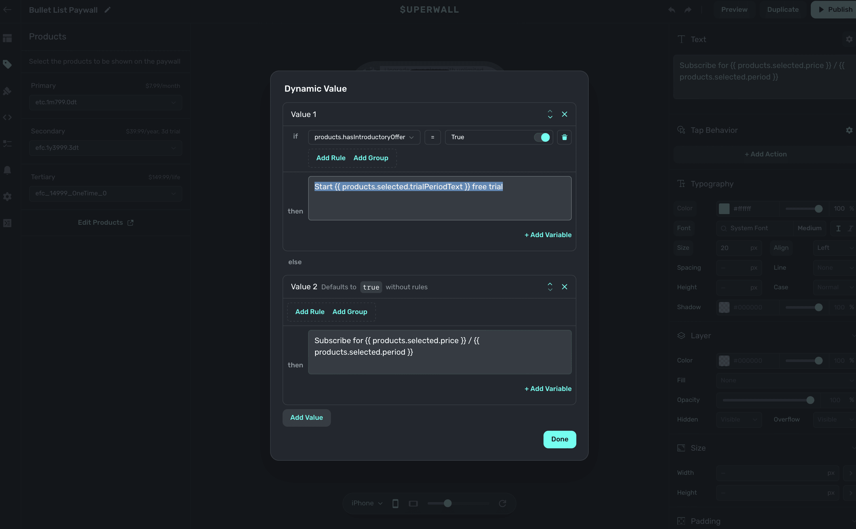 - Then set the text of the component to "Start {{ products.selected.trialPeriodText }} free trial" (i.e. what to do when a condition is met)